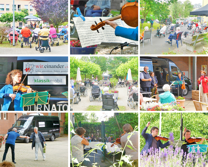 Insgesamt 17 Einsätze hatte das KLASSIKMOBIL im Frühjahr 2020 vor Alten- & Pflegeheimen in Lechenich und Bergisch-Gladbach, Neuss, Bochum, Dormagen und Leverkusen. Unterstützt vom Verein wir.einander. e.V. und zahllosen privaten Spendern brachten wir so Konzertatmosphäre zu den Menschen, die wochenlang CORONA-bedingt keine Chance hatten, die Heime zu verlassen!